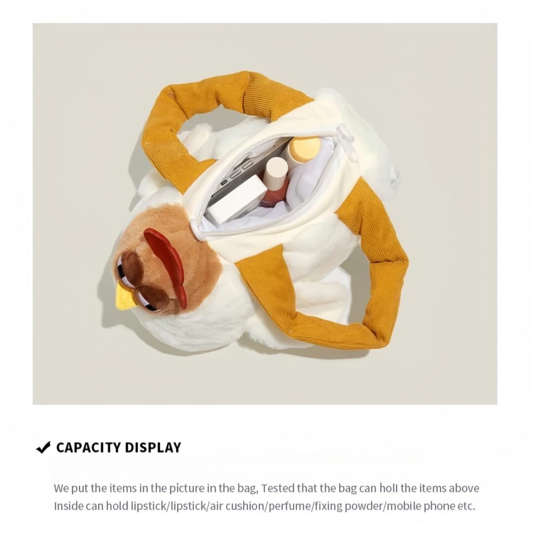 Step into the world of playful fashion with this adorable plush chicken handbag, a perfect blend of fun design and practical use. Crafted from soft, high-quality plush fabric with a durable polyester lining, this kawaii animal tote is both cuddly and sturdy—ideal for girls, teens, and women who love quirky accessories. The fluffy white body and expressive brown face give it a charming, slightly sassy look that’s sure to turn heads wherever you go.