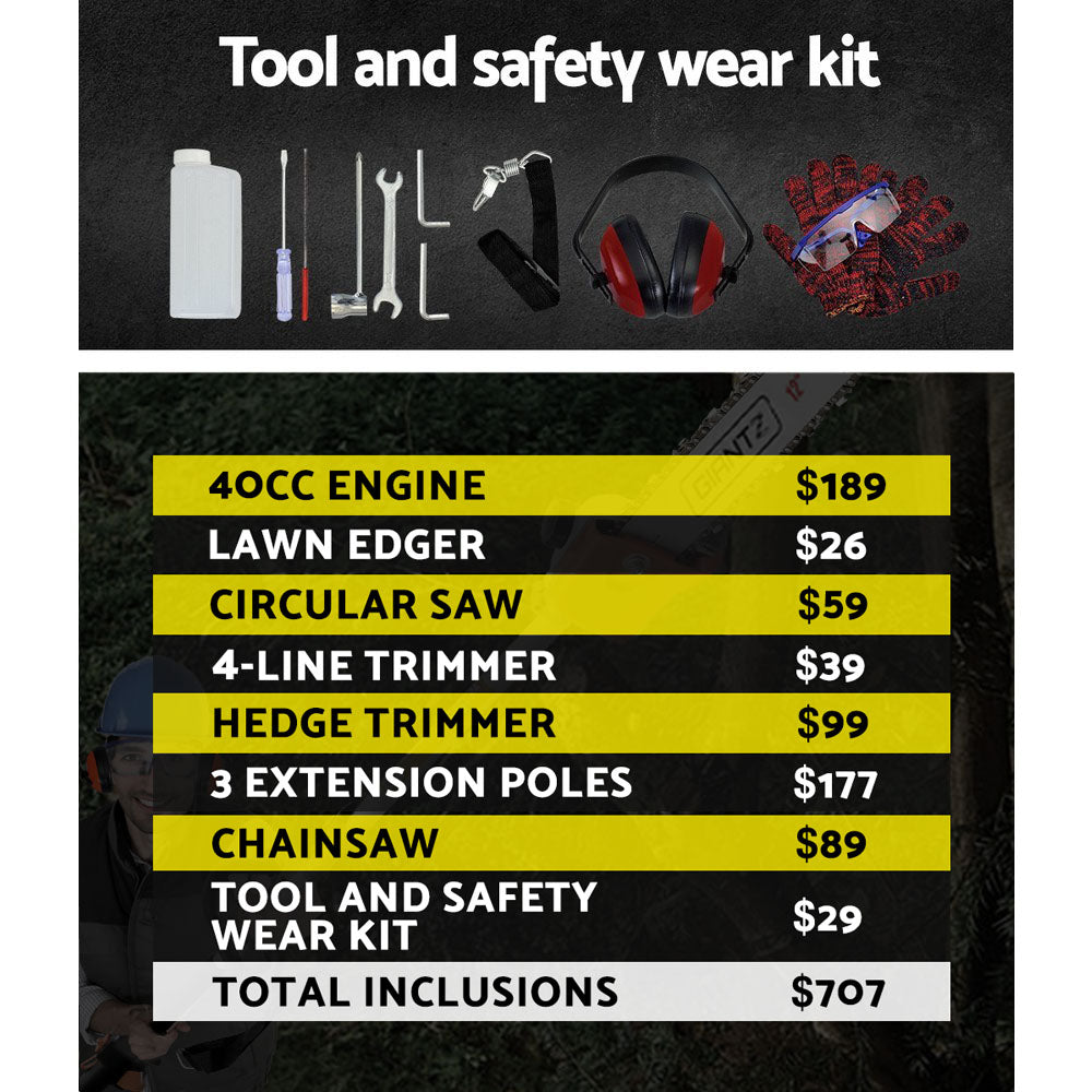 Giantz 40CC Pole Chainsaw Hedge Trimmer Brush Cutter Whipper Saw 4-Stroke 7-in-1
