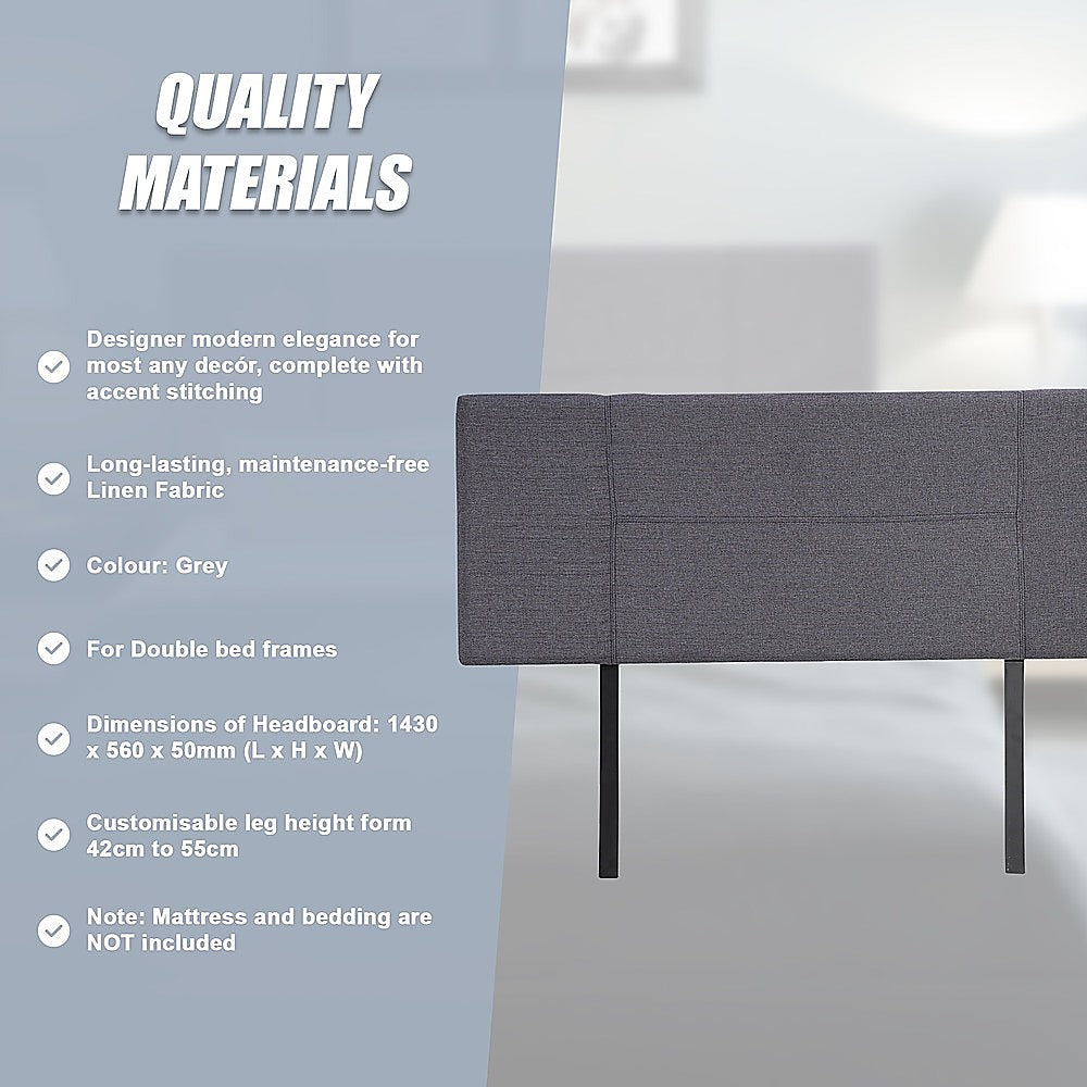 This headboard for standard Double-sized bed frames is created with quality materials, including easy-to-maintain Linen Fabric that will maintain its sophisticated look for many years to come. This particular model comes with elegant stitching accents that provide just the right level of understated pop. A neutral grey will blend seamlessly with a wide variety of bed frames and other bedroom furniture.