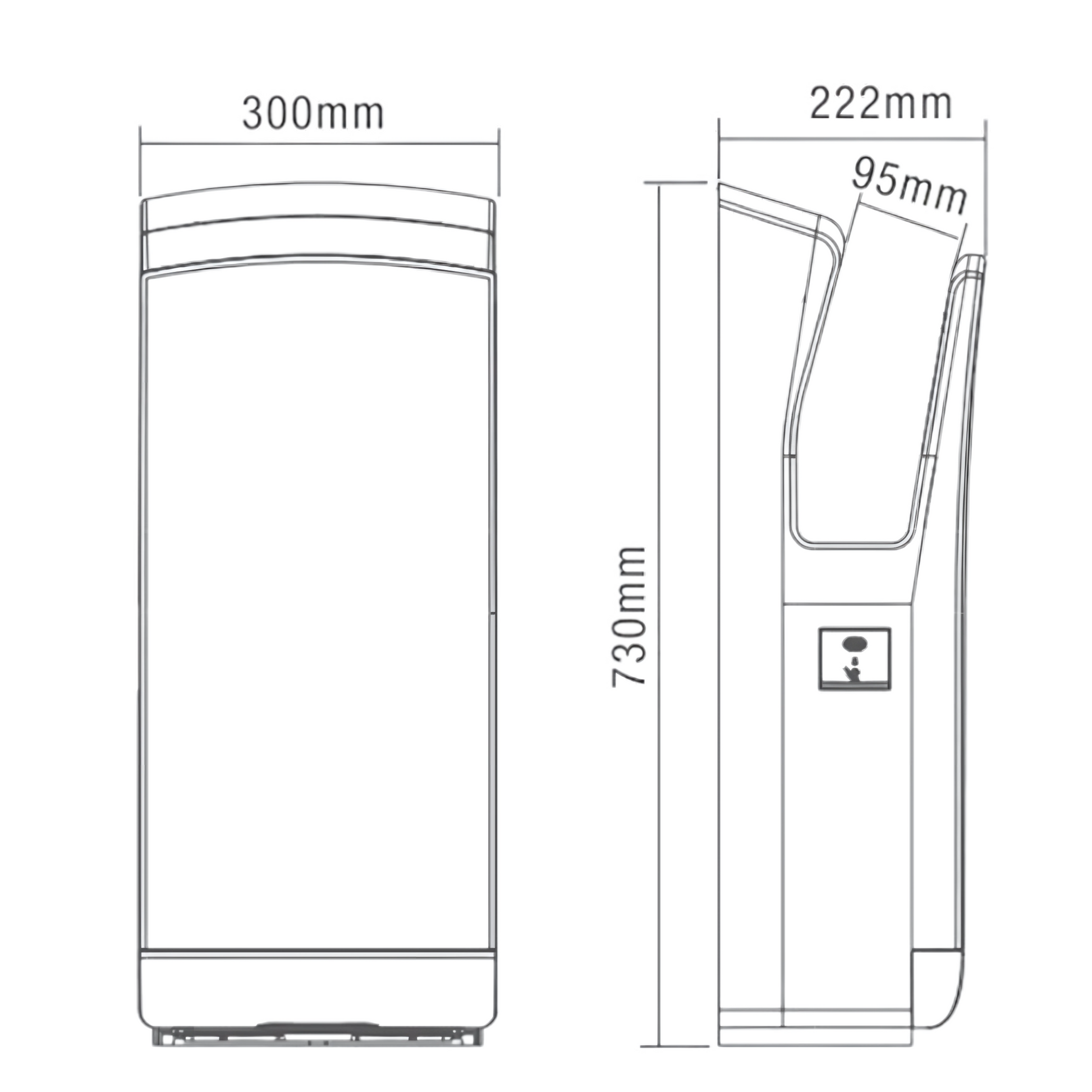 Fast Drying: Utilizes an 85 m/s airspeed to swiftly remove water from hands, similar to a windscreen wiper, ensuring hands are dry and hygienic in less than 10 seconds.